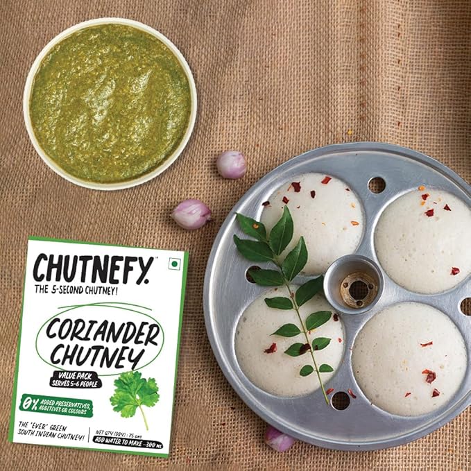 One amongst the Chutney trinity and part of our Staples Range, the Chutnefy Coriander Chutney brings to you that classic flavour that goes perfectly with your crisp Dosai & Vadai & Adai, or a soft and fluffy idli - actually, with anything you'd like a mild and flavourful accompaniment for!